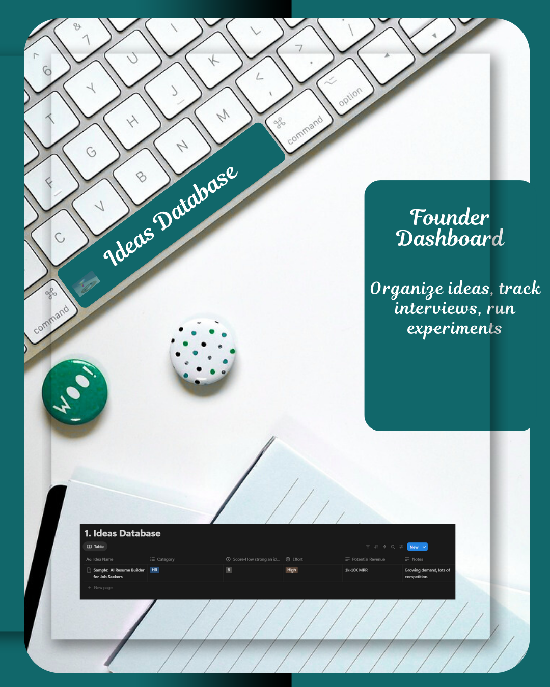 - Notion workspace: idea validation checklist, competitor research, feature prioritization